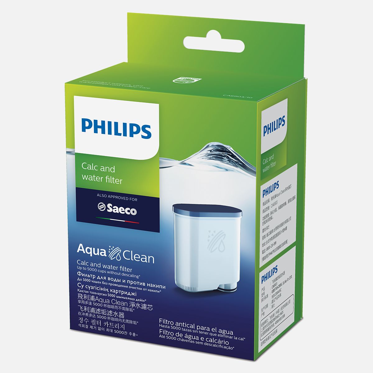 Grâce au filtre à eau breveté AquaClean de Saeco, vous n’avez pas à détartrer votre machine à espresso pour une durée équivalente allant jusqu’à 5 000 tasses*