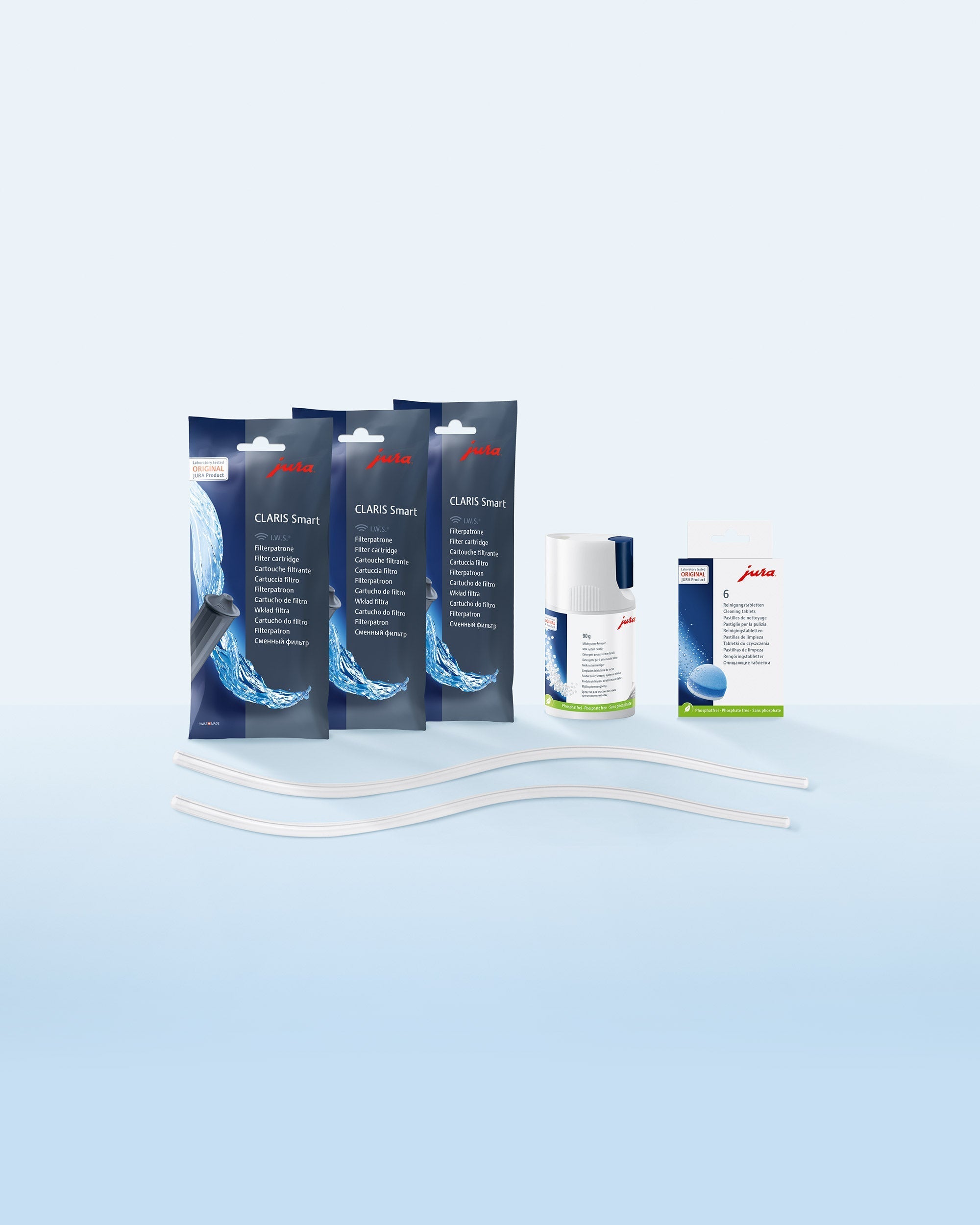 Le nouveau Care Kit contient tous les produits d’entretien importants. Il se compose de 3 cartouches filtrantes CLARIS Smart +, 6 pastilles de nettoyage, 1 détergent pour système de lait (mini tabs) et 2 tuyaux de lait.