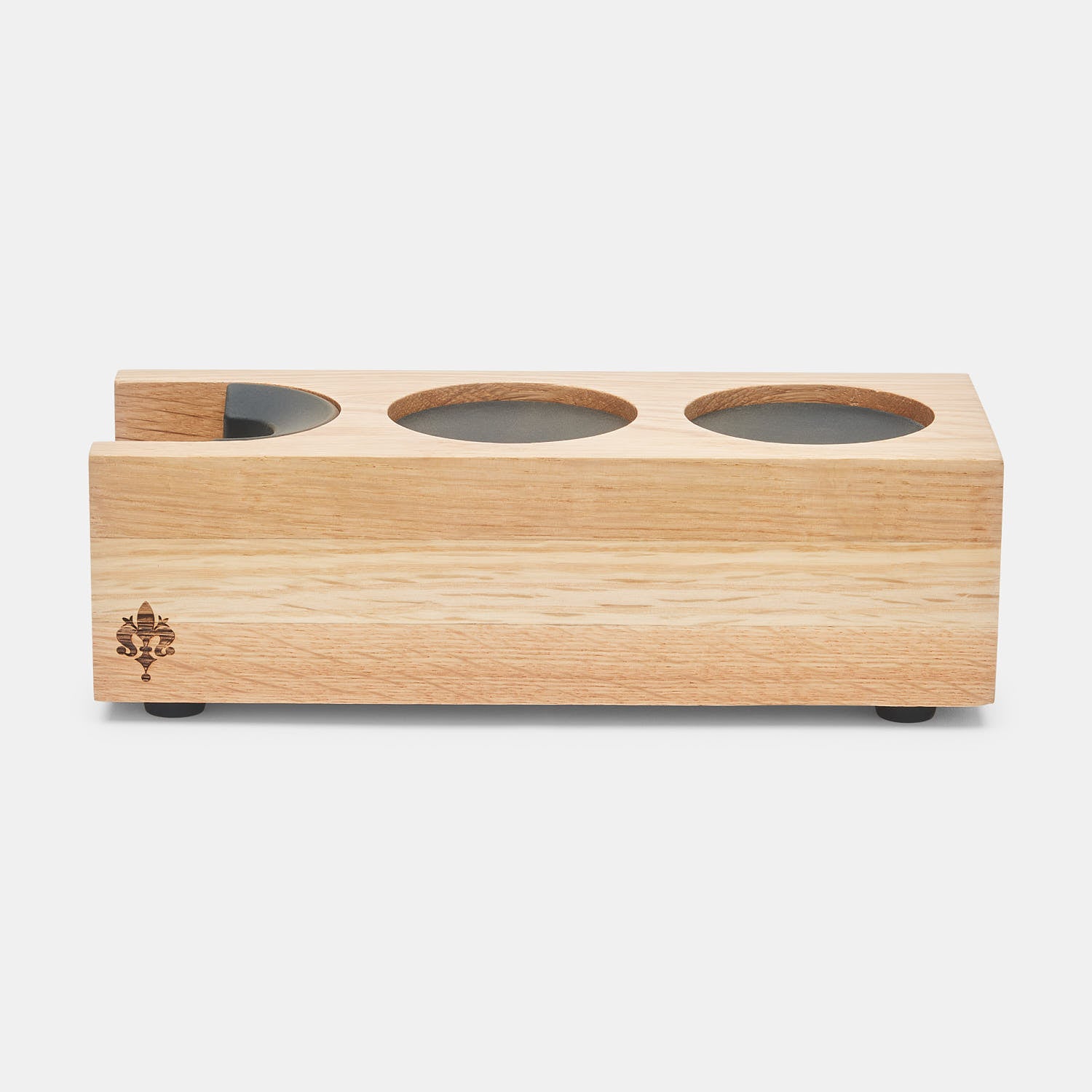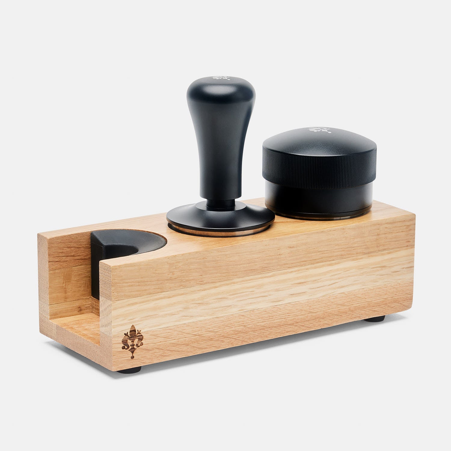Support en bois de chêne pour tenir le porte-filtre en équilibre lors du tassage du café. Offre aussi un espace de rangement pour presse-café et outil de nivelage.