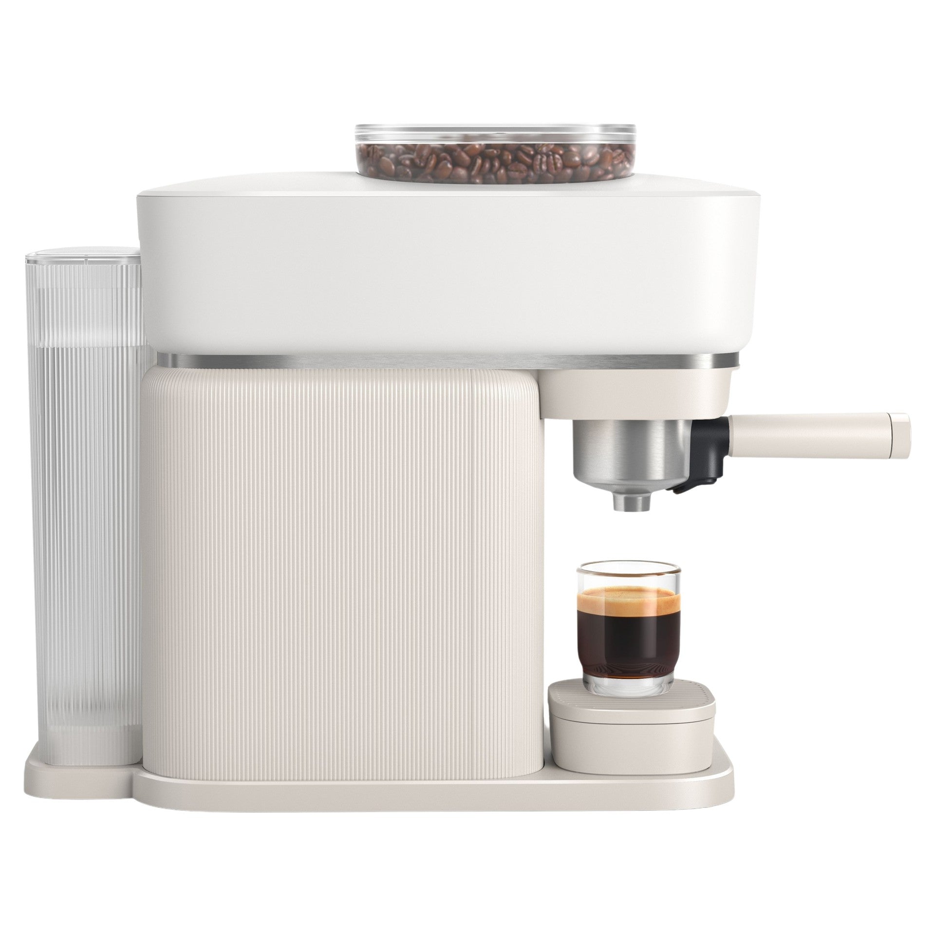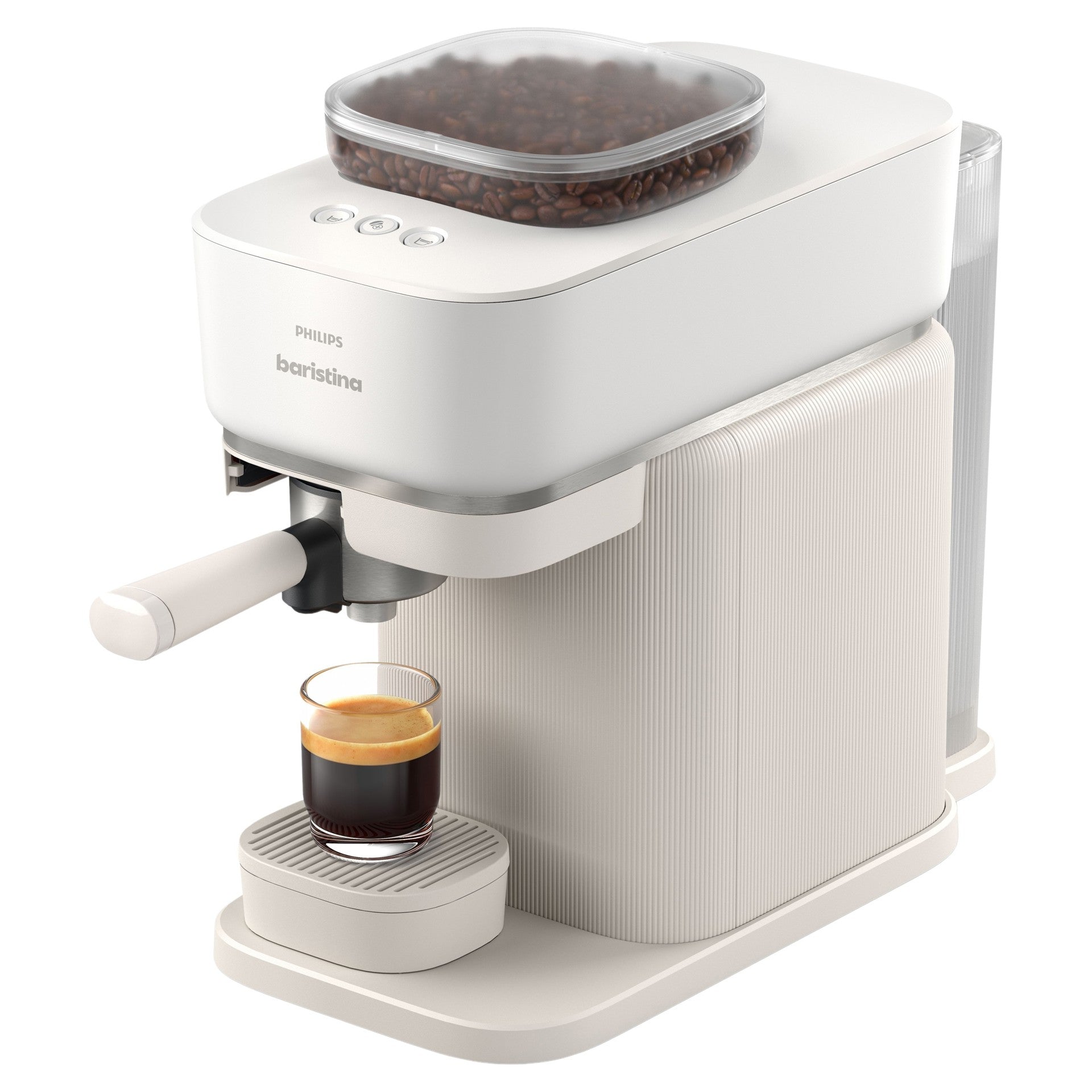 • Broyage et tassage automatiques : La machine Baristina moud les grains à la finesse idéale, les tasse directement dans le porte-filtre, et extrait le café avec une pression précise pour un arôme et une saveur optimaux, le tout en un seul mouvement fluide.