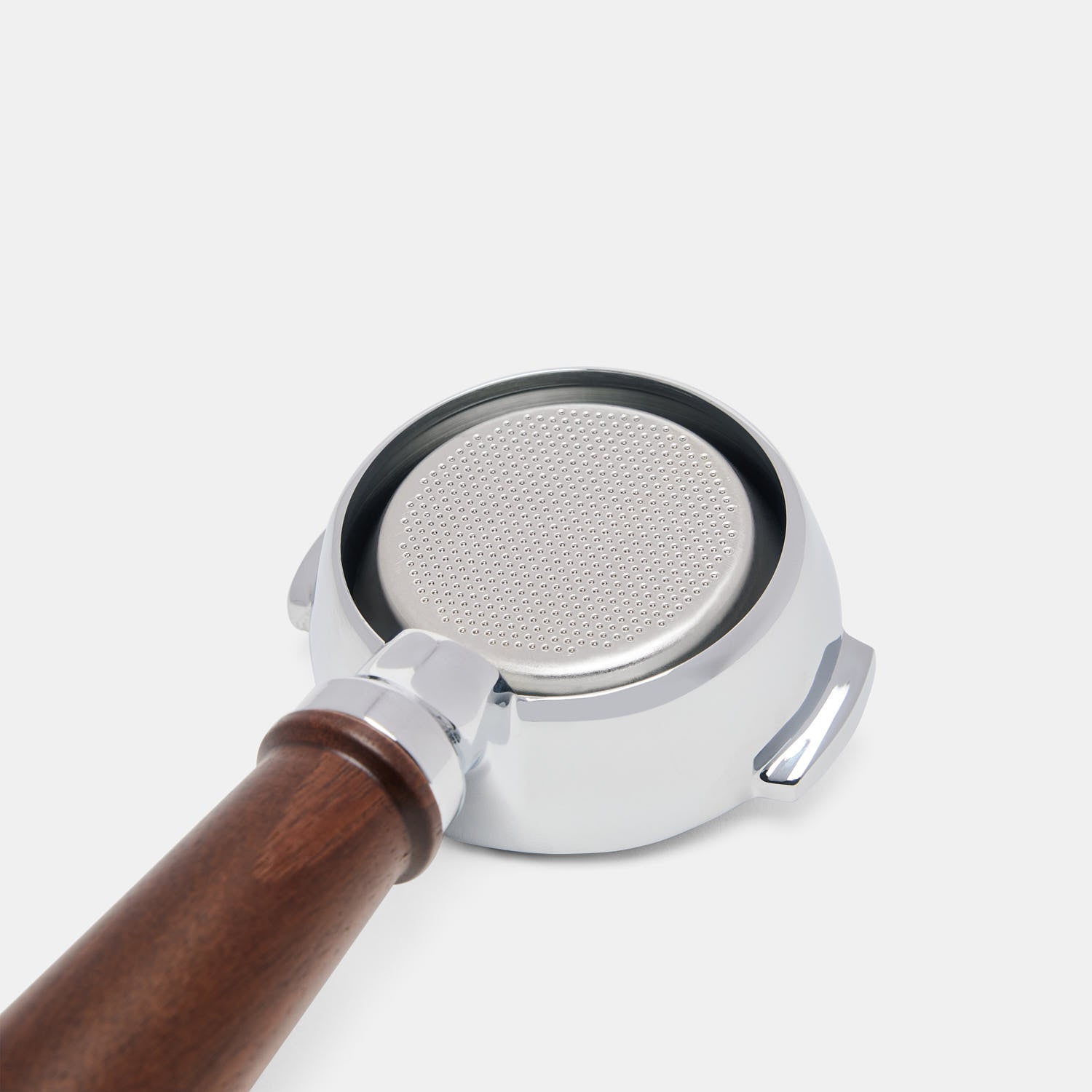 - un porte-filtre 58mm en acier inoxydable sans fond avec poignée inclinée en bois de noyer